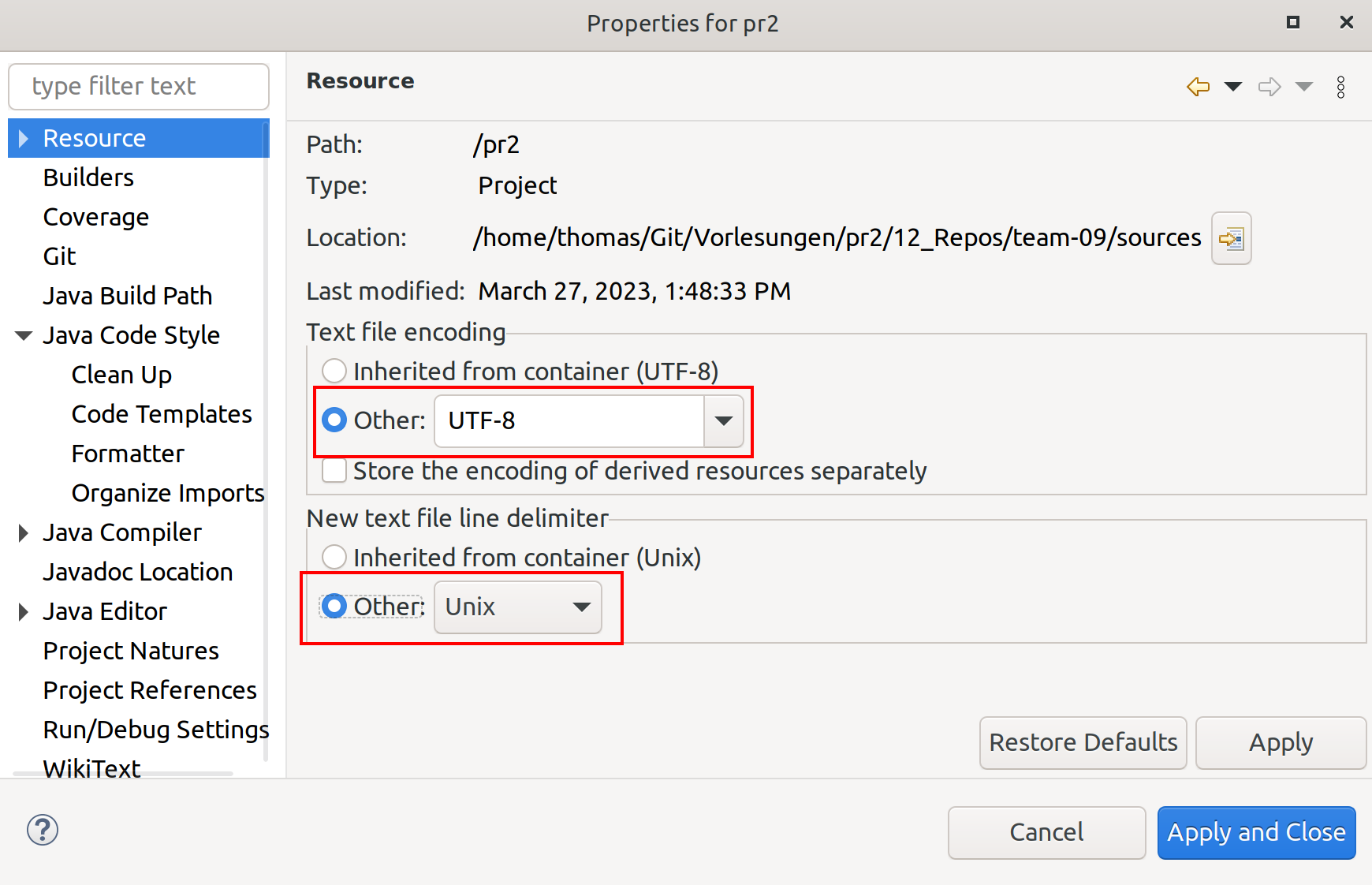 Setzen Sie die Option Text file encoding auf UTF-8 und New text file line delimiter auf Unix.